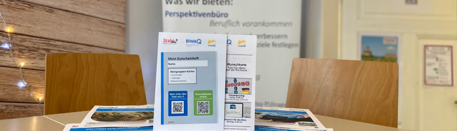 Mit diesem Gutscheinheft können sie alle Angebote von Stabi-plus II nutzen, von Bewerbungscoaching und Lebenslauf-Aktualisierung bis hin zu Gesprächen zu Alltags- und Lebensfragen sowie gezielter Unterstützung in unseren Kleingruppen.